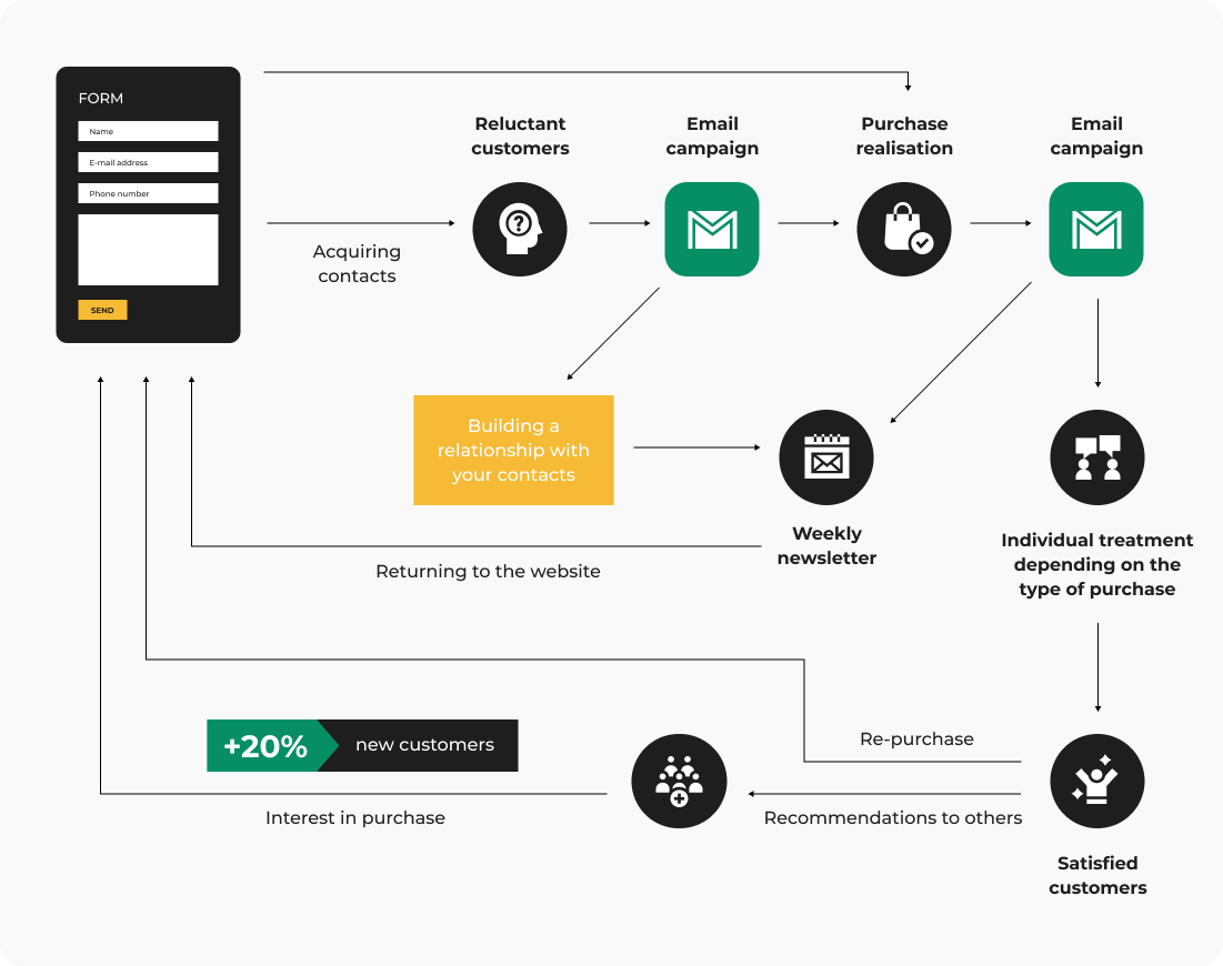 Working with us offers a unique experience, as we fully dedicate ourselves to understanding your industry and field. We step into your shoes and view the world through your eyes, which enables us to place and optimize ads with exceptional precision for maximum impact. We will carefully prepare your email marketing strategy and review your existing database. To achieve the best results, we also focus on segmenting your database, creating customized texts, and designing graphics.